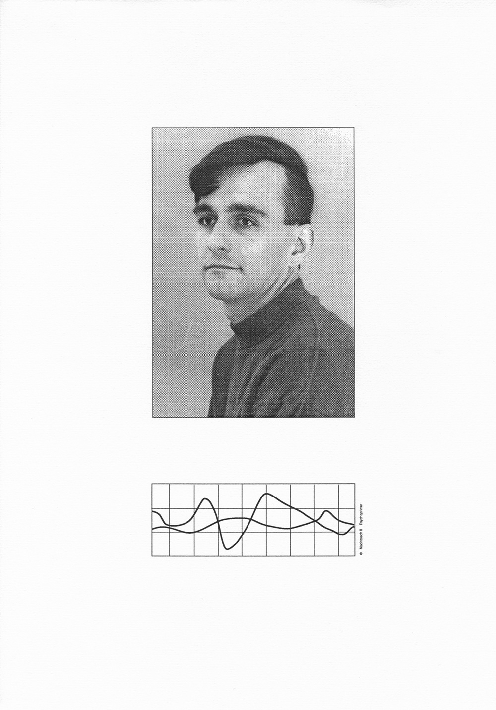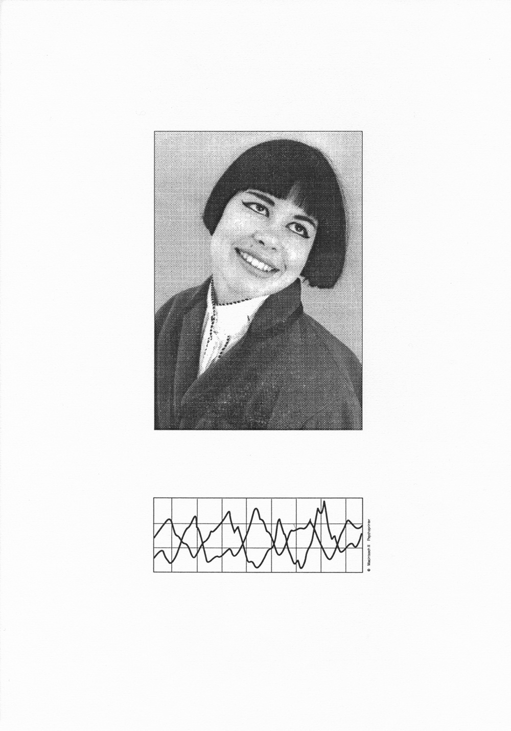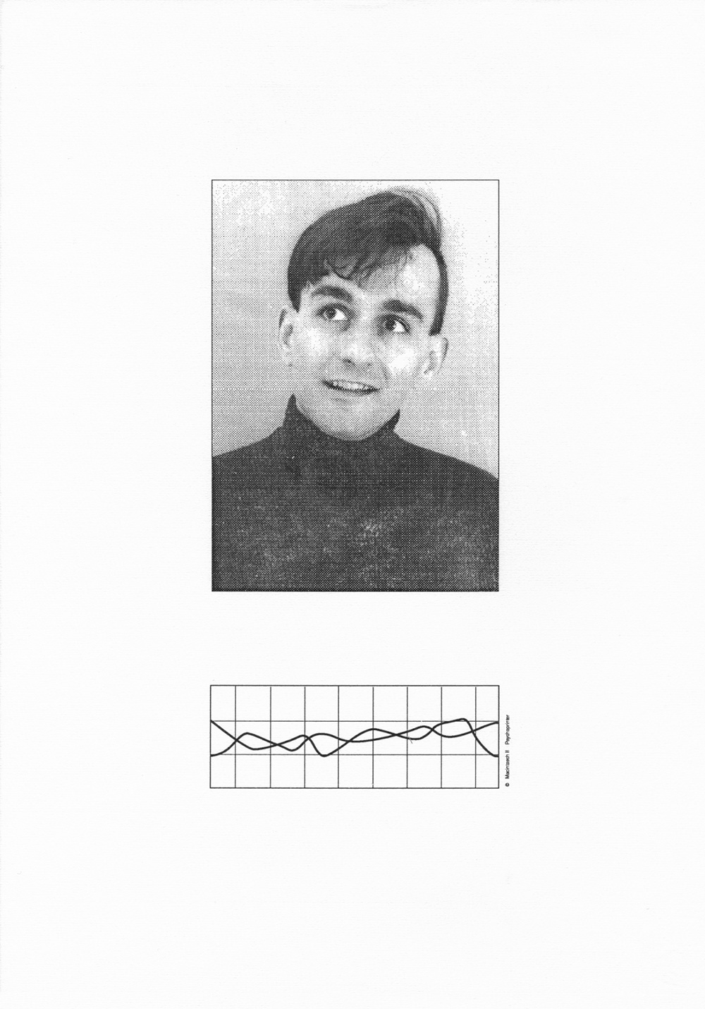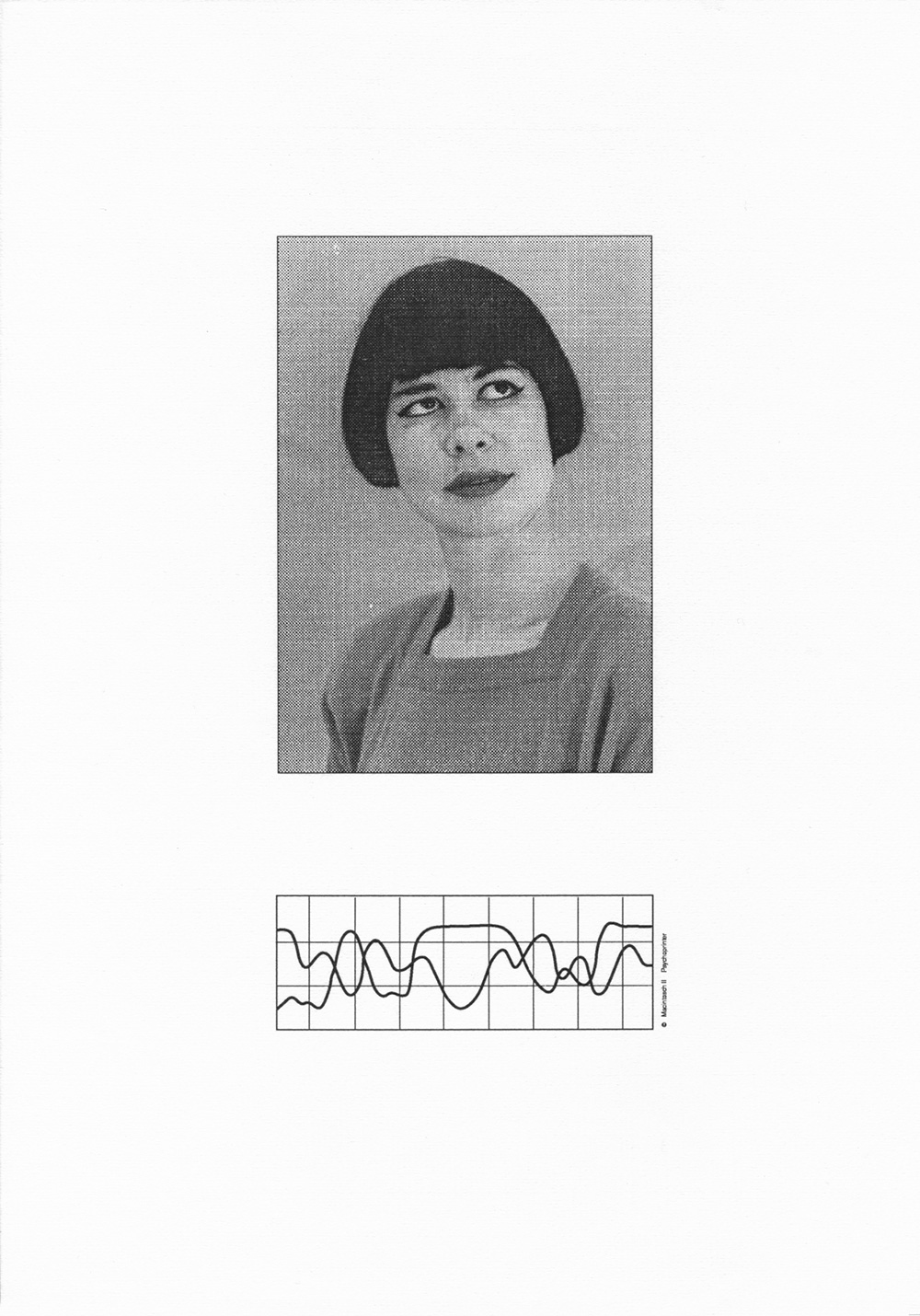 Unter den Fotos sind Kurven eines „Psychoprinters“ zu sehen, der Haltung und Ausdruck zu interpretieren scheint und die Vorstellung suggeriert, Persönlichkeit ließe sich aus fotografischen Oberflächen herauslesen.