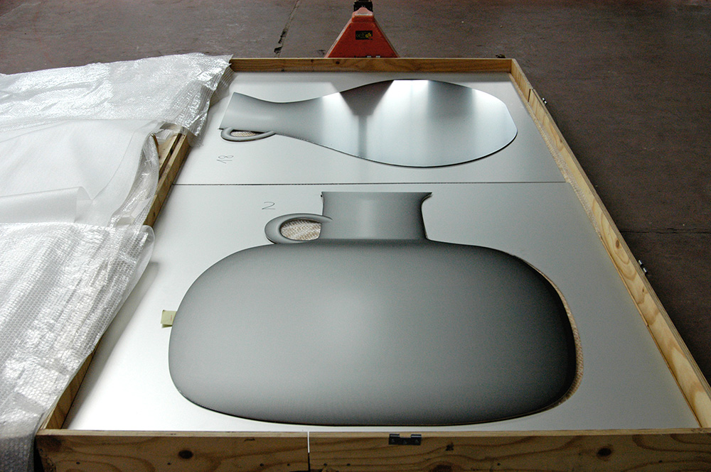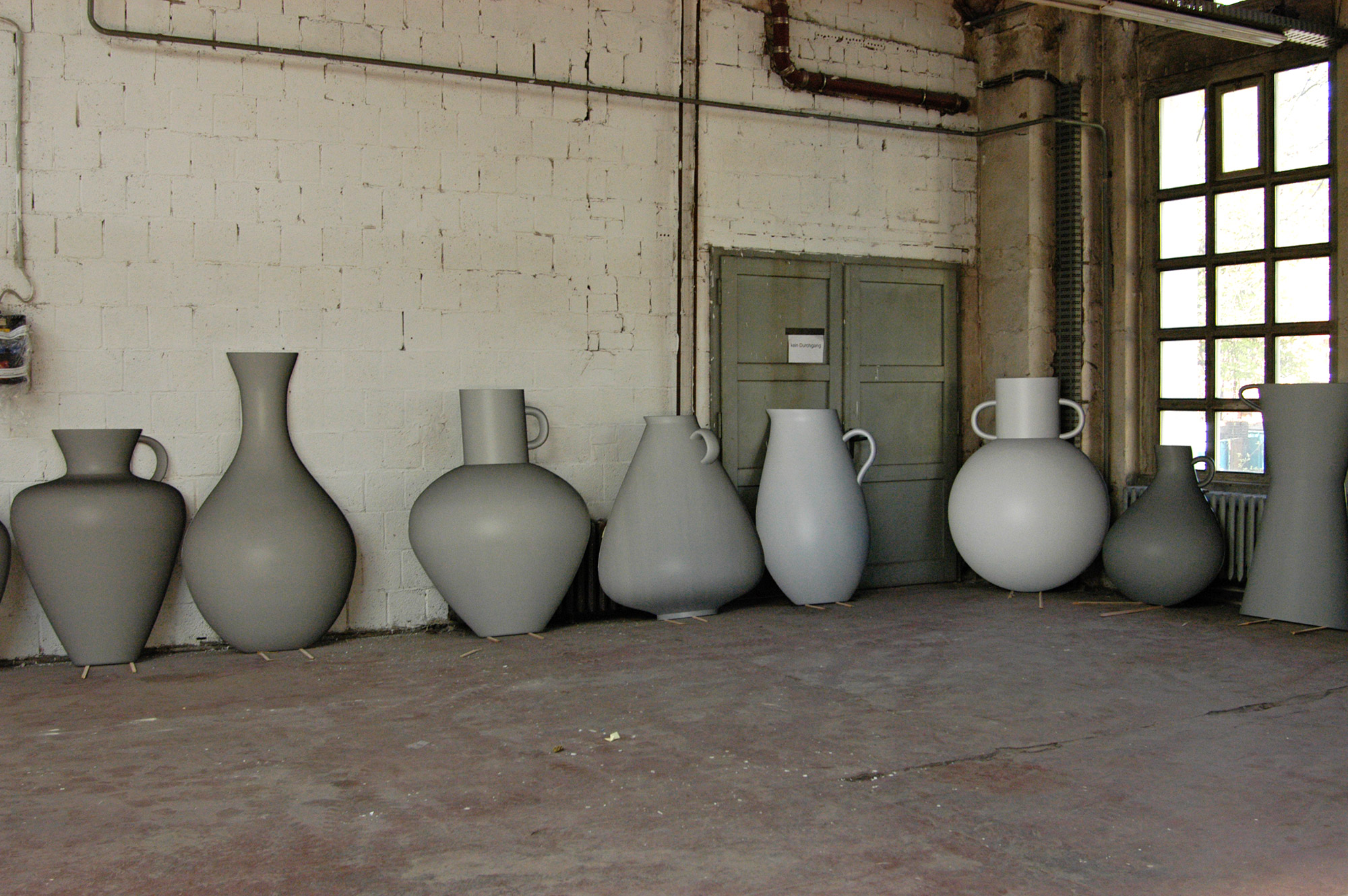 Am Ende des Weges angelangt geben wir der alten Geschichte des Milchmädchens eine neue Wendung. In der Fabel zerbricht über die imaginierte Geldvermehrung der Krug und die Milch zerrinnt – das Startkapital ist dahin. Hier erwartet die Besucher an der 16m hohen Wand, die den Weg abschließt, ein Depot, das mit Krügen gut gefüllt ist. Als überdimensionierte Cut-Outs in 23 Formenvarianten sind sie wie in einem Hochregal übereinander gereiht. Neben materiellem Wohlstand repräsentiert dieser Speicher die Fülle von Optionen, die in der Zukunft enthalten sind.