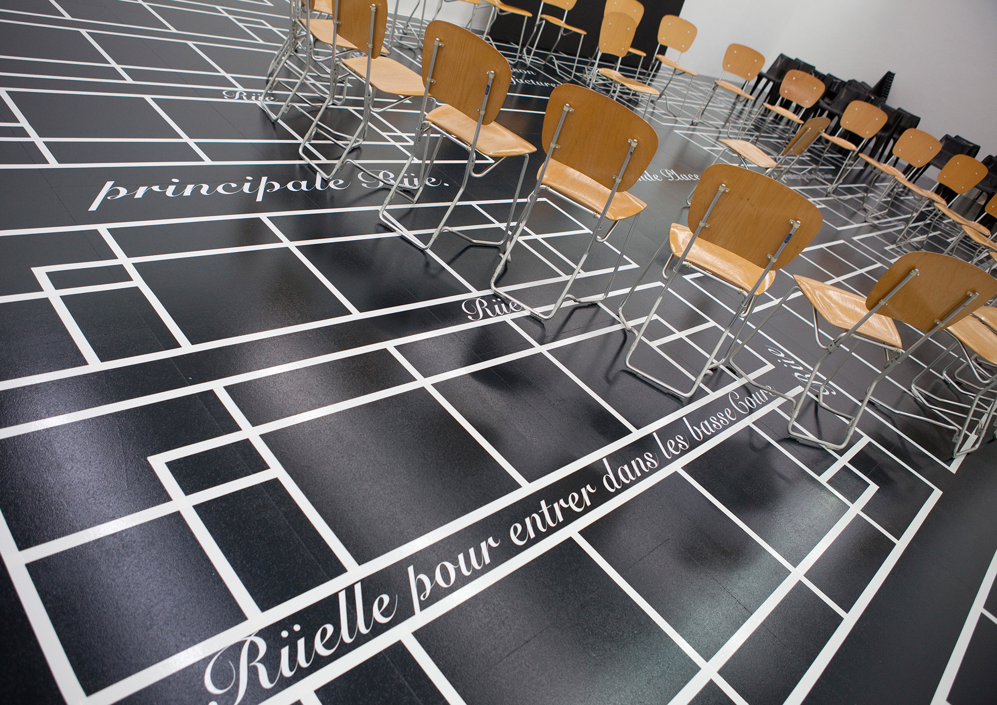 Das ist der gedankliche Hintergrund, vor dem wir Paradigmenwechsel von öffentlichem Raum, Möglichkeiten der Aneignung und Nutzung urbaner Territorien betrachten. Die titelgebende zentrale Arbeit bezieht sich auf den Grundriss der Planstadt Erlangen. Sie nutzt ihn als Feld für choreographische Notationen und zirkelt ein Spielfeld für Auseinandersetzungen ab. In den Kabinetten des Erdgeschosses und in den Kellergewölben stellen wir aktuelle Projekte vor, die sich auf andere Städte beziehen: auf São Paulo und die brasilianische Hauptstadt Brasília, das neue Hafenviertel Bjørvika in Oslo, die Elbinsel Veddel in Hamburg, auf Heterotopien in Kopenhagen und Berlin. Hier entwickeln wir Planspiele zum Städtebau, Szenarien zu Besetzung von Orten, Strategien der (Um-)Ettikettierung und Umnutzung von Raum und diskutieren die Rollen von Bewohnern und Publikum als Akteuren der polis.