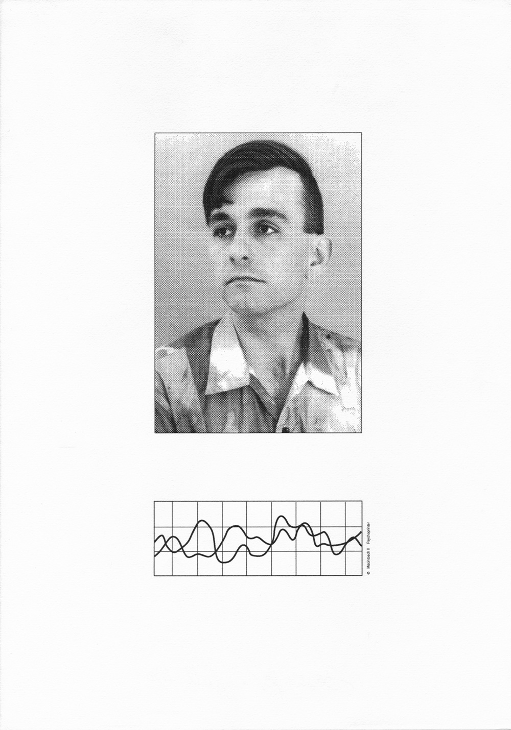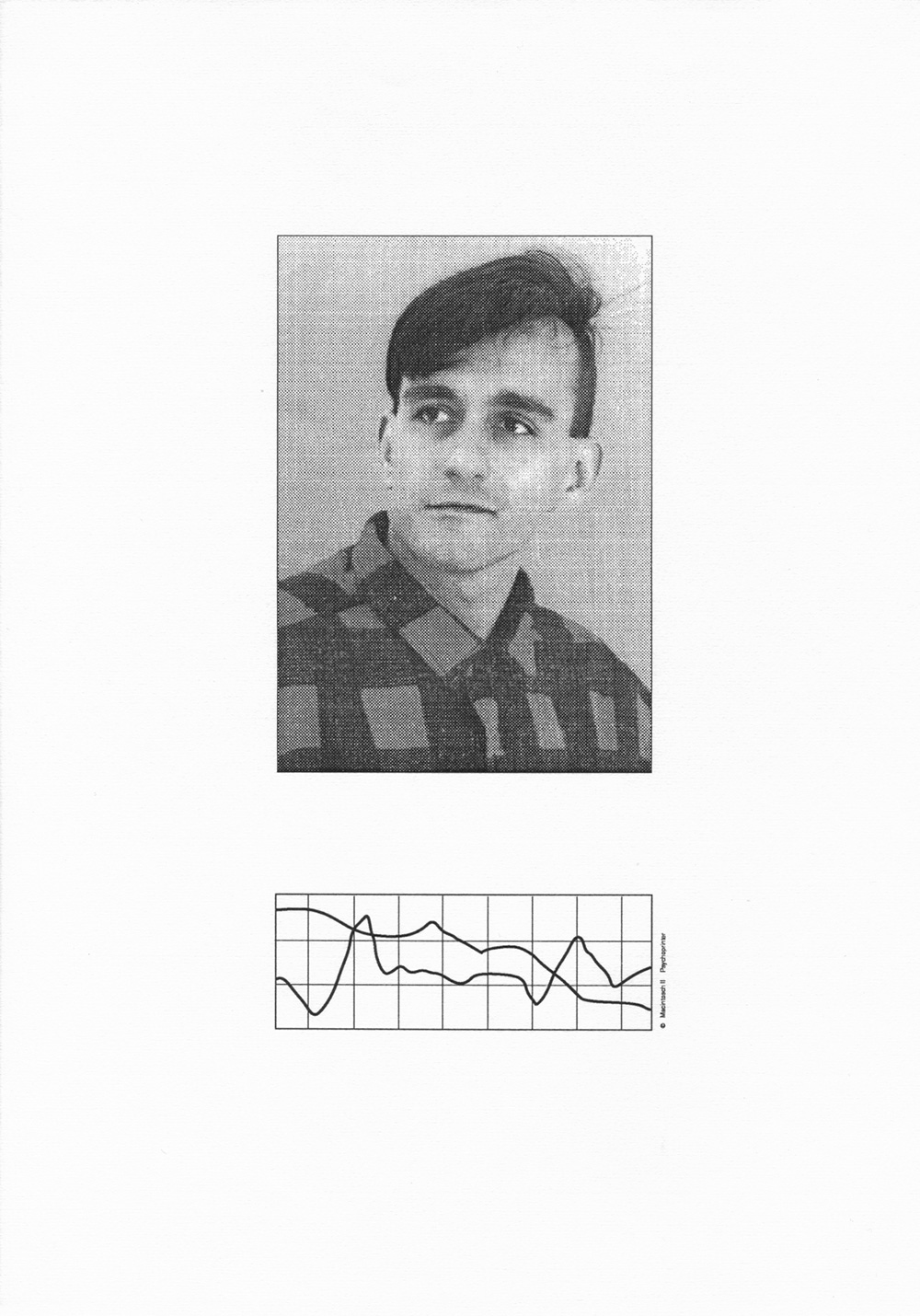 Unter den Fotos sind Kurven eines „Psychoprinters“ zu sehen, der Haltung und Ausdruck zu interpretieren scheint und die Vorstellung suggeriert, Persönlichkeit ließe sich aus fotografischen Oberflächen herauslesen.