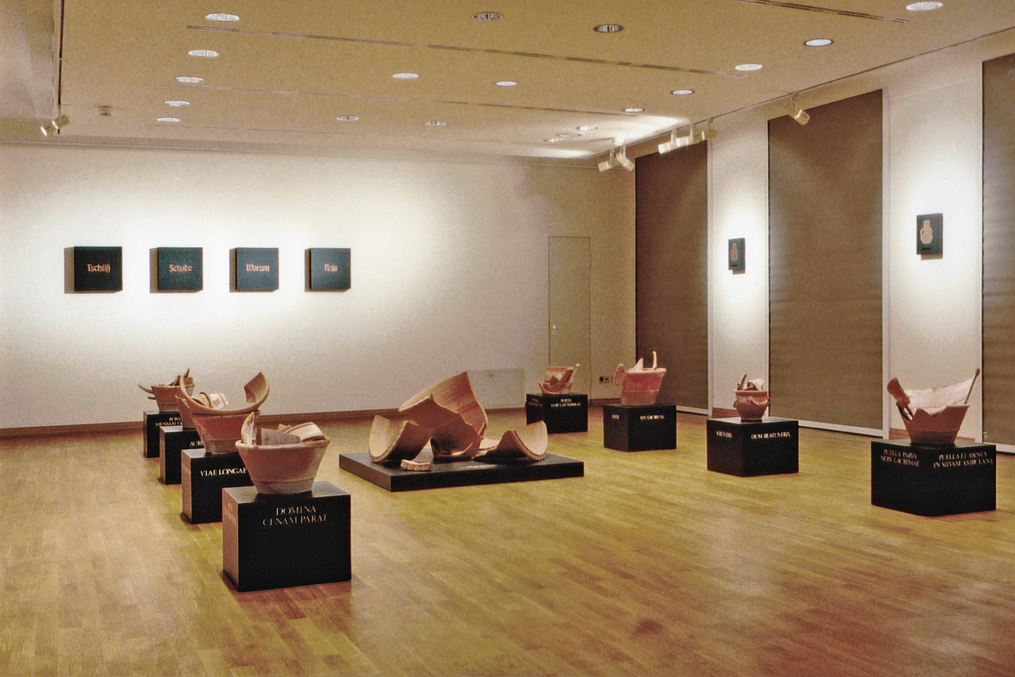 Zeitgleich mit der Neupräsentation der Sammlung eröffnete unsere Abschlussausstellung im Ritterhaus Museum, mit der wir museale Praktiken spiegelten. Von uns vor Ort gefundene Tonscherben arrangierten wir auf graulackierten Sockeln. Erste einfache Sätze aus dem Lateinlehrbuch Ars Latina wurden zu Inschriften, die wir im Siebdruck auf die Sockel aufbrachten: DOMINA CENAM PARAT, VIAE LONGAE SUNT usw. Mit Blattkupfer belegte Bildtafeln ergänzten die Präsentation.
