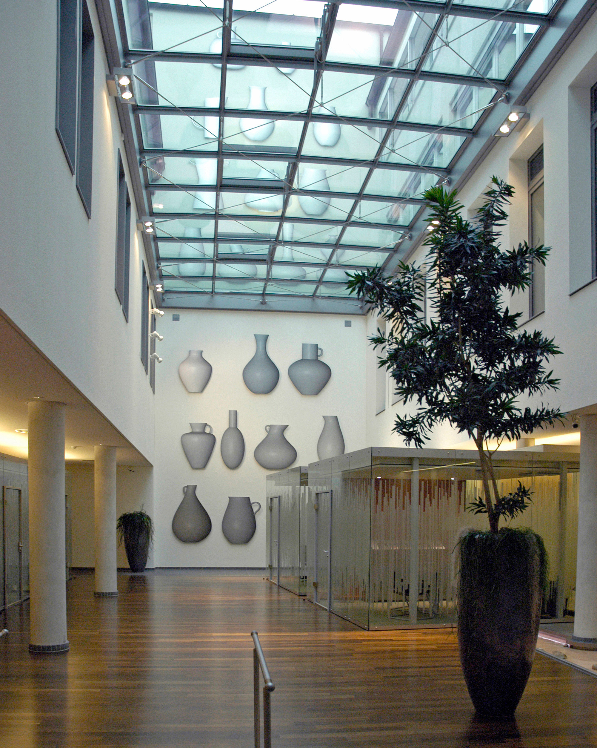 Am Ende des Weges angelangt geben wir der alten Geschichte des Milchmädchens eine neue Wendung. In der Fabel zerbricht über die imaginierte Geldvermehrung der Krug und die Milch zerrinnt – das Startkapital ist dahin. Hier erwartet die Besucher an der 16m hohen Wand, die den Weg abschließt, ein Depot, das mit Krügen gut gefüllt ist. Als überdimensionierte Cut-Outs in 23 Formenvarianten sind sie wie in einem Hochregal übereinander gereiht. Neben materiellem Wohlstand repräsentiert dieser Speicher die Fülle von Optionen, die in der Zukunft enthalten sind.